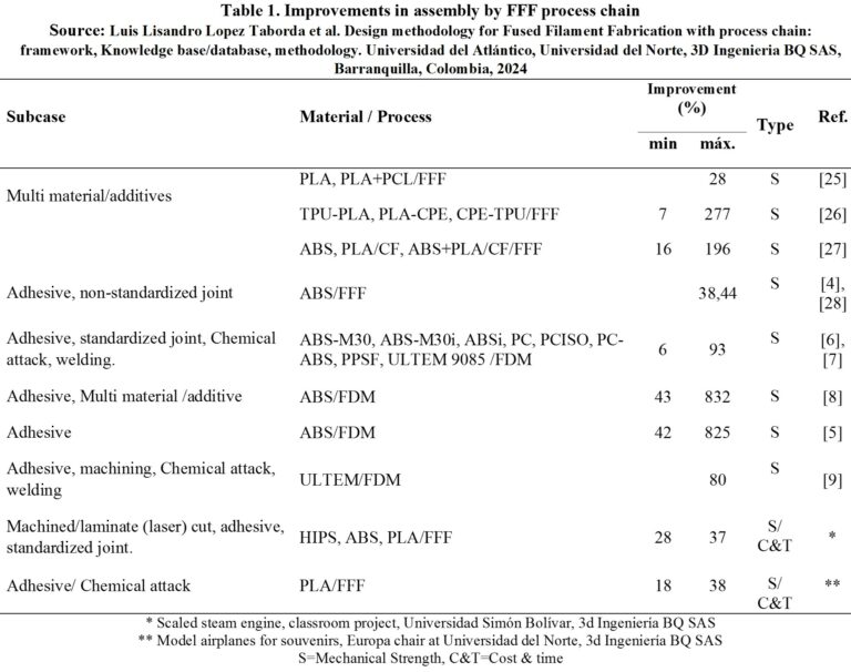During the case analysis, improvements in properties such as tolerances, roughness, mechanical strength, and times/costs were identified through the combination of FFF or FDM with conventional processes. Table 1 provides a partial overview of the results obtained specifically for the assembly case.