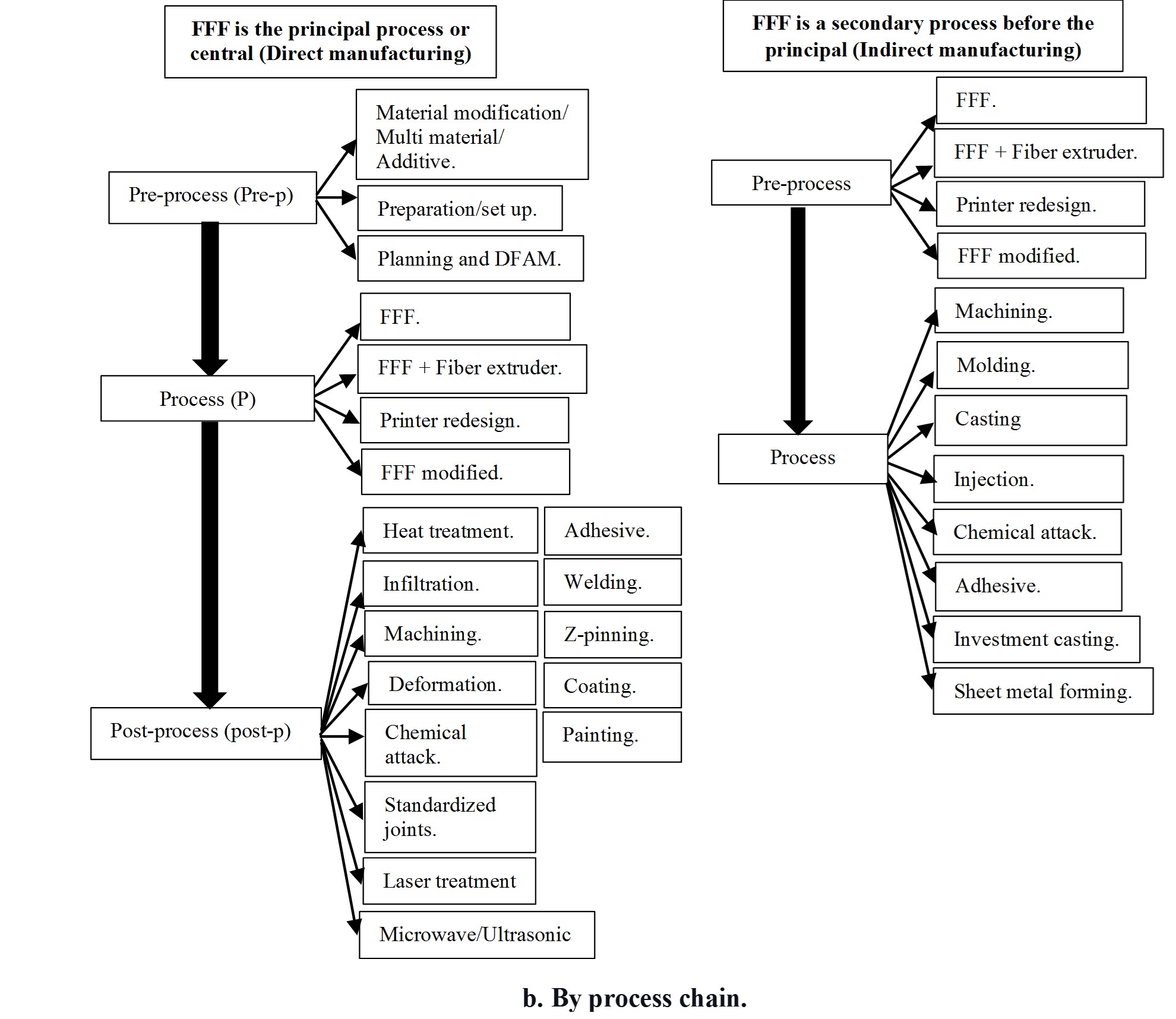 “Hybrid-AM processes” uses AM with one or more secondary processes or energy sources that are fully coupled and affect part quality, functionality, and process yield ” [1]. In this page, “process chain” refers to post-processing operations or secondary processes that do not involve full coupling. The term “FFF process chain or process chain with FFF” refers to combining conventional manufacturing processes with FFF or FDM.