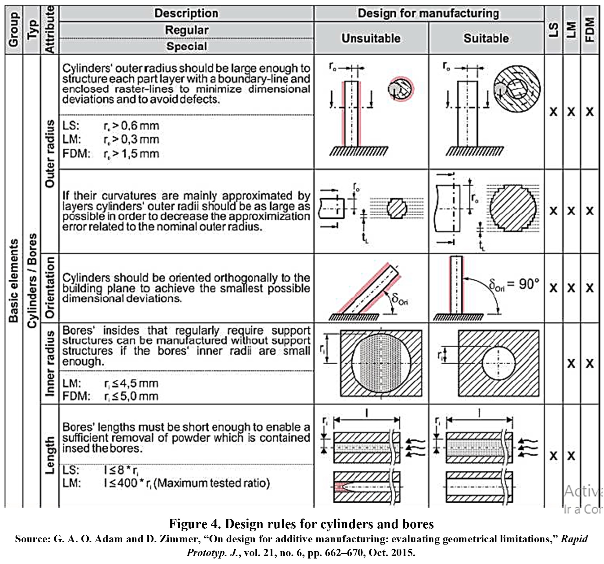 Along the same lines, Figures 3-4 [7] guide the walls, printed cylinders, and bores and their process limits.
