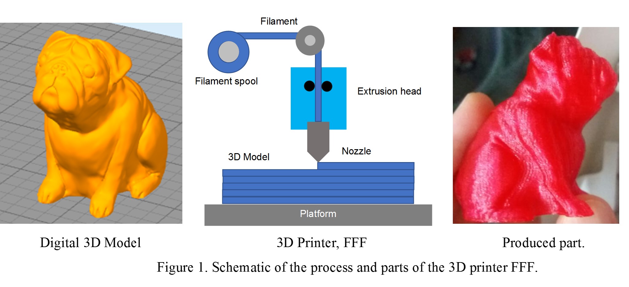 Figure 1 shows a schematic that, from the data of a 3D digital model, the printer manufactures the model layer upon layer. FFF uses a roll of thermoplastic polymer filament as raw material. The filament then passes through an extrusion head with a thermoelectric heating element that melts the filament. Finally, the melted filament is deposited and solidified through a nozzle on the platform.