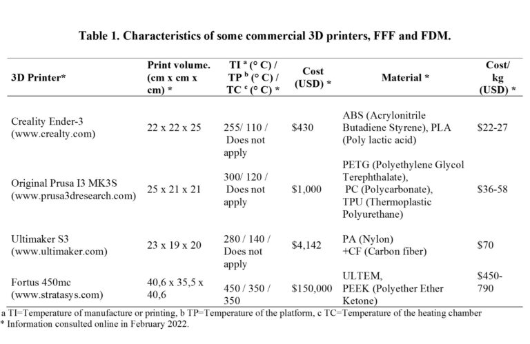 Table 1 summarizes the characteristics of various 3D printers and materials, all of which are FFF, except for the Fortus 450 mc, a Stratasys FDM.