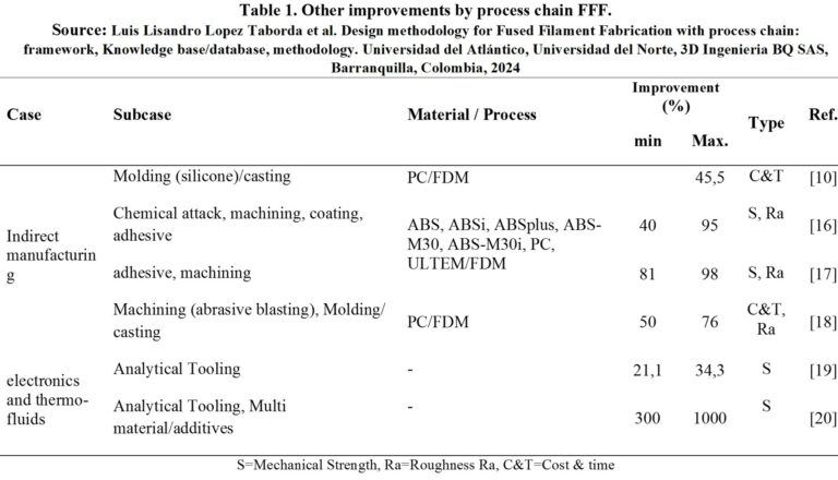 During the case analysis, improvements in properties such as tolerances, roughness, mechanical strength, and times/costs were identified through the combination of FFF or FDM with conventional processes. Table 1 provides a partial overview of the results obtained specifically for the assembly and others case.