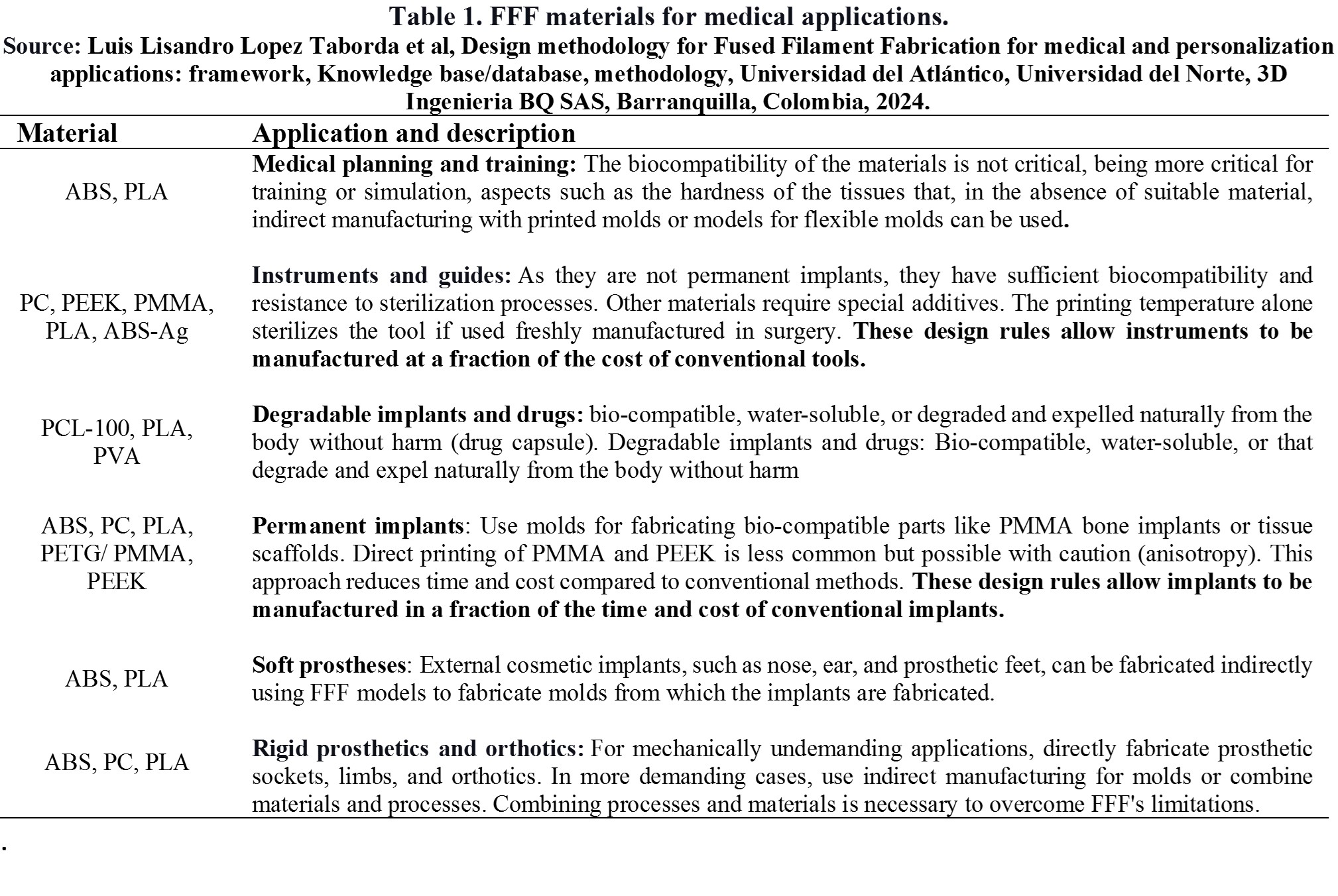 [8]        Luis Lisandro Lopez Taborda et al, Design methodology for Fused         Filament     Fabrication for medical and personalization applications: framework, Knowledge base/database, methodology, Universidad del Atlántico, Universidad del Norte, 3D Ingenieria BQ SAS, Barranquilla, Colombia, 2024.