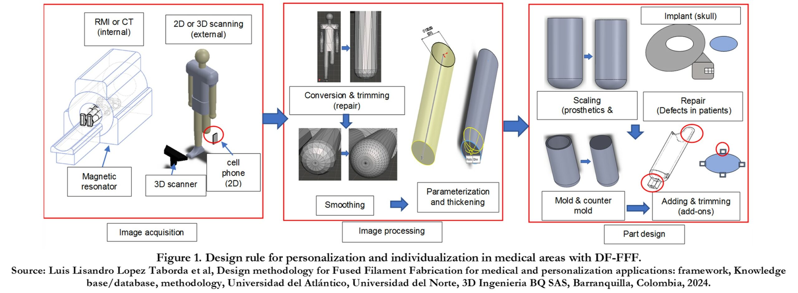 [1] Luis Lisandro Lopez Taborda et al, Design methodology for Fused Filament Fabrication for medical and personalization applications: framework, Knowledge base/database, methodology, Universidad del Atlántico, Universidad del Norte, 3D Ingenieria BQ SAS, Barranquilla, Colombia, 2024.