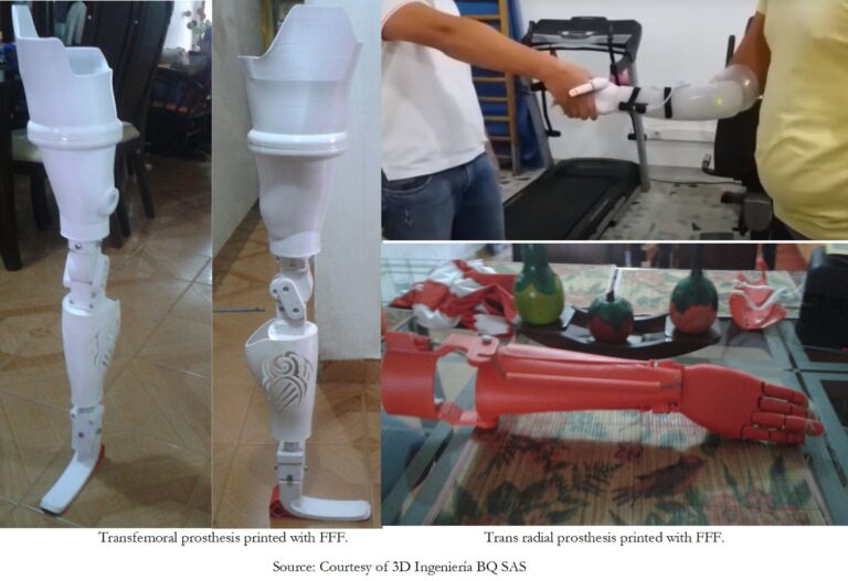 • Upper limb prostheses. Although not as mechanically demanding as the lower ones, growing infants require more changes of prostheses due to limb size changes, which implies high costs for part replacement. The low cost and rapid production of printed prostheses offset the extra costs due to changes [19]. Something similar could be concluded with lower limb prostheses for people in growth.