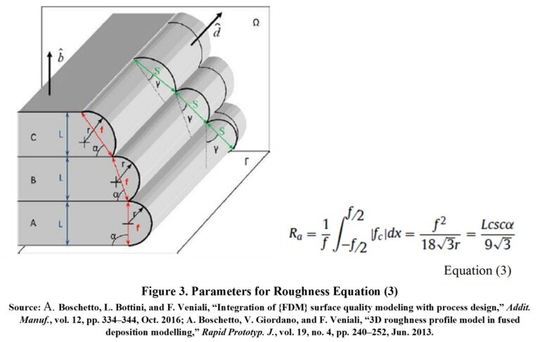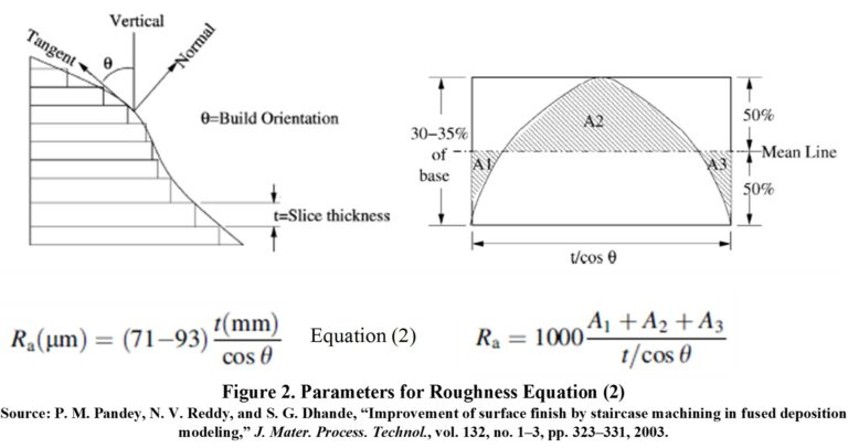 Ra (μm)L-height or layer thickness, α-surface angle with respect to the printing table, Ra-Roughness Ra12.830005981992Roughness is calculated with Equation (3) [3], [4] (see Figure 3): the model works properly for angles between 30 and 150°.