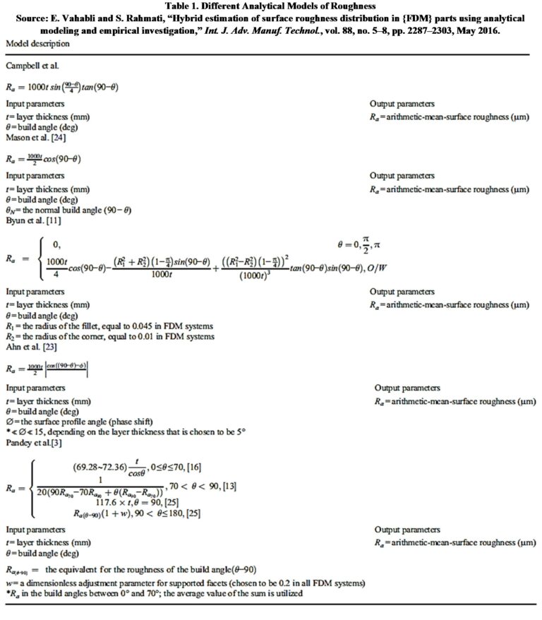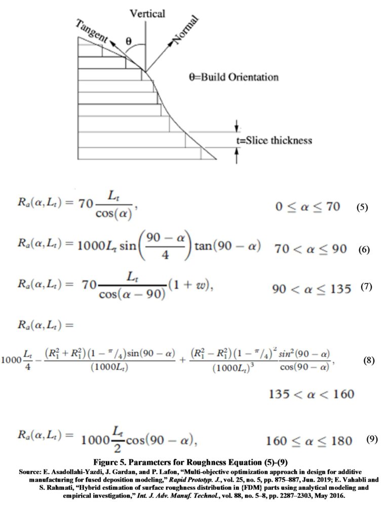 Ra (μm)Lt-layer thickness in mm, α-surface angle with respect to vertical, Ra-roughness Ra 14Roughness is calculated with Equation (5) [6], [7] (see Figure 5): a hybrid model is proposed by merging analytical models, and finding the best accuracy ranges for each analytical model, it works for 0° to 70°.